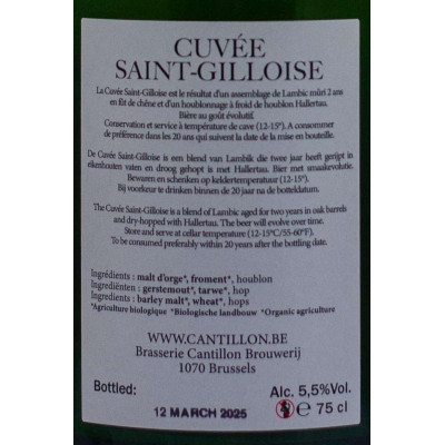 Cantillon Cuvée Saint-Gilloise (ex Cuvée des Champions) è un lambic a fermentazione spontanea ottenuto da lambic di due anni maturati in rovere e quindi dry-hoppati – in genere con Hallertau Mittelfrüh – prima dell’imbottigliamento, dove la rifermentazione avviene con una piccola aggiunta di sciroppo di zucchero: un metodo che esalta la finezza acida senza ricorrere a blend con lambic giovani.
