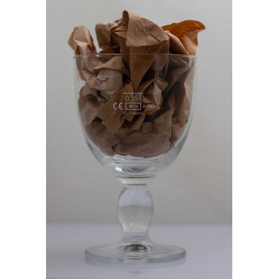Coppa con profilo dorato. Sul fronte il logo del birrificio. Sul retro la tacca di livello a 25 cl. Piede e stelo lavorati con scritte in rilievo