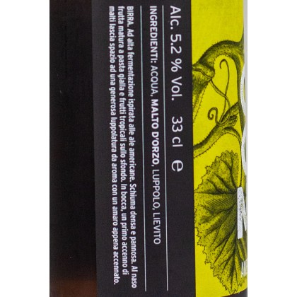 American Pale Ale di razza. Dal colore dorato carico e dalla schiuma persistente si intuisce che non è come le altre. Al naso importanti note di frutta gialla e ananas sono il preludio ad un corpo medio e un sapore di cereale che scompare con l’arrivo dell’amaro. Questo gioco sensoriale insolito per lo stile la rende unica e suadente. È molto facile innamorarsene.