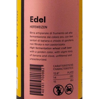 Edel si ispira alle Weizen, tradizionali birre di frumento della cultura brassicola tedesca, create con l'intento essere consumate fresche e di dissetare!rinfrescare il bevitore. Nel profilo aromatico si ritrovano note di banana e chiodi di garofano e in un secondo momento sfumature riconducibili a vaniglia, cereali e crosta di pane.