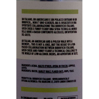 Un italiano (Agostino di Birrificio Italiano), una americano (Evan di Green Cheek) e un polacco (Michal di Funky Fluid) entrano in un birrificio… Non è uno scherzo ma il risultato di una divertente collaborazione. Una sida tecnica al mondo delle birre a basso contenuto alcolico, un'avventura del gusto che ha portato ad una birra divertente e di grande carattere. I tre luppoli scelti da ogni birraio sono stati bilanciati, è stato fatto un leggero dry hopping e una rifermentazione con krausening in serbatoio.