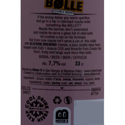 Mister B Bolle è una Double NEIPA artigianale da 7,7% vol nata in collaborazione con il birrificio danese Alefarm, una birra bionda dal colore giallo intenso tendente all’aranciato, naturalmente torbida e coronata da una schiuma bianca, compatta e persistente, che anticipa una bevuta morbida e succosa. Al naso esplode un concentrato di luppolo moderno: grazie all’impiego di varietà come HQG1, Azacca CGX e Amarillo CGX emergono profumi intensi di frutta tropicale matura (mango, ananas, papaya), agrumi dolci e resine, con una leggera vena dank che richiama le migliori New England americane. In bocca Bolle è piena e avvolgente, con corpo cremoso e vellutato, carbonazione fine e un amaro presente ma ben integrato che arriva solo nel finale a bilanciare la dolcezza maltata, lasciando il palato pulito e pronto al sorso successivo; la gradazione alcolica è molto ben nascosta, rendendola pericolosamente beverina.