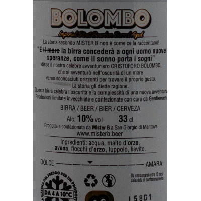 Bolombo è una imperial stout affinata in botti di bourbon, avvolgente, brassata con malto d’orzo e una generosa quota di avena e fiocchi d’orzo che le regalano corpo vellutato e una schiuma color cappuccino compatta. Nel bicchiere si presenta ebano con lievi riflessi mogano; al naso arrivano tostature pulite di caffè e cacao, note di pane nero e una sfumatura caramellata, mentre in bocca è piena ma scorrevole: dolcezza maltata iniziale, tostato elegante, amaro misurato e finale lungo e caldo.